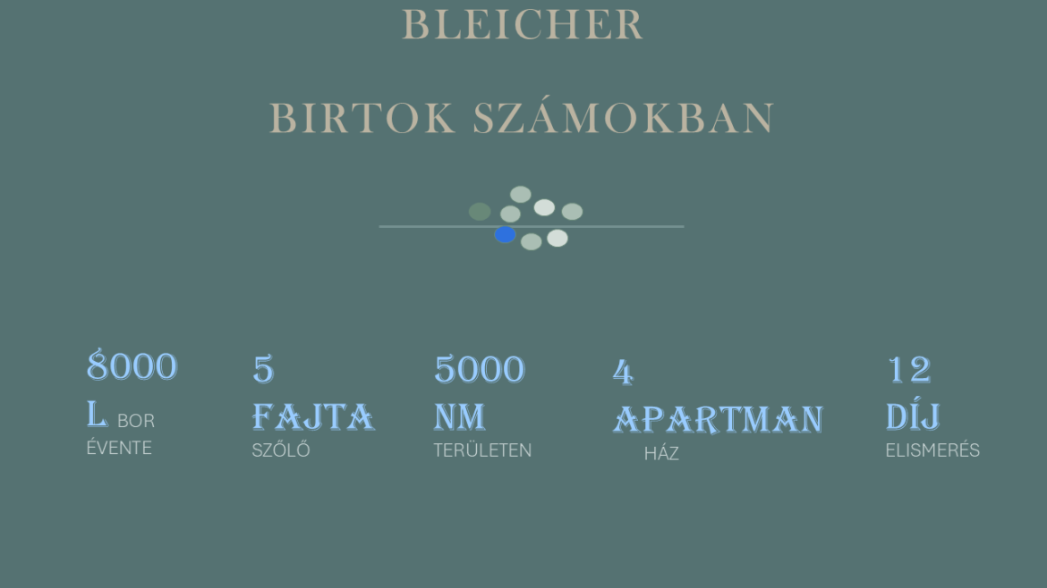 A Bleicher Borászatot 2012-ben alapítottuk a Balaton partján, a Balatonboglári borvidéken. Kézi szüretelésű, hagyományos technológiával készült hordós érlelésű borokat kínálunk. Területünk mostanra már több mint 8 hektár. A mai napig építjük a gazdaságot, terveink között szerepel egy fedett rendezvényhelyszín kialakítása, sétány építése a gazdaság egyik végéből a másikba, és a Nádfedeles Múzeum bővítése, megnyitása.